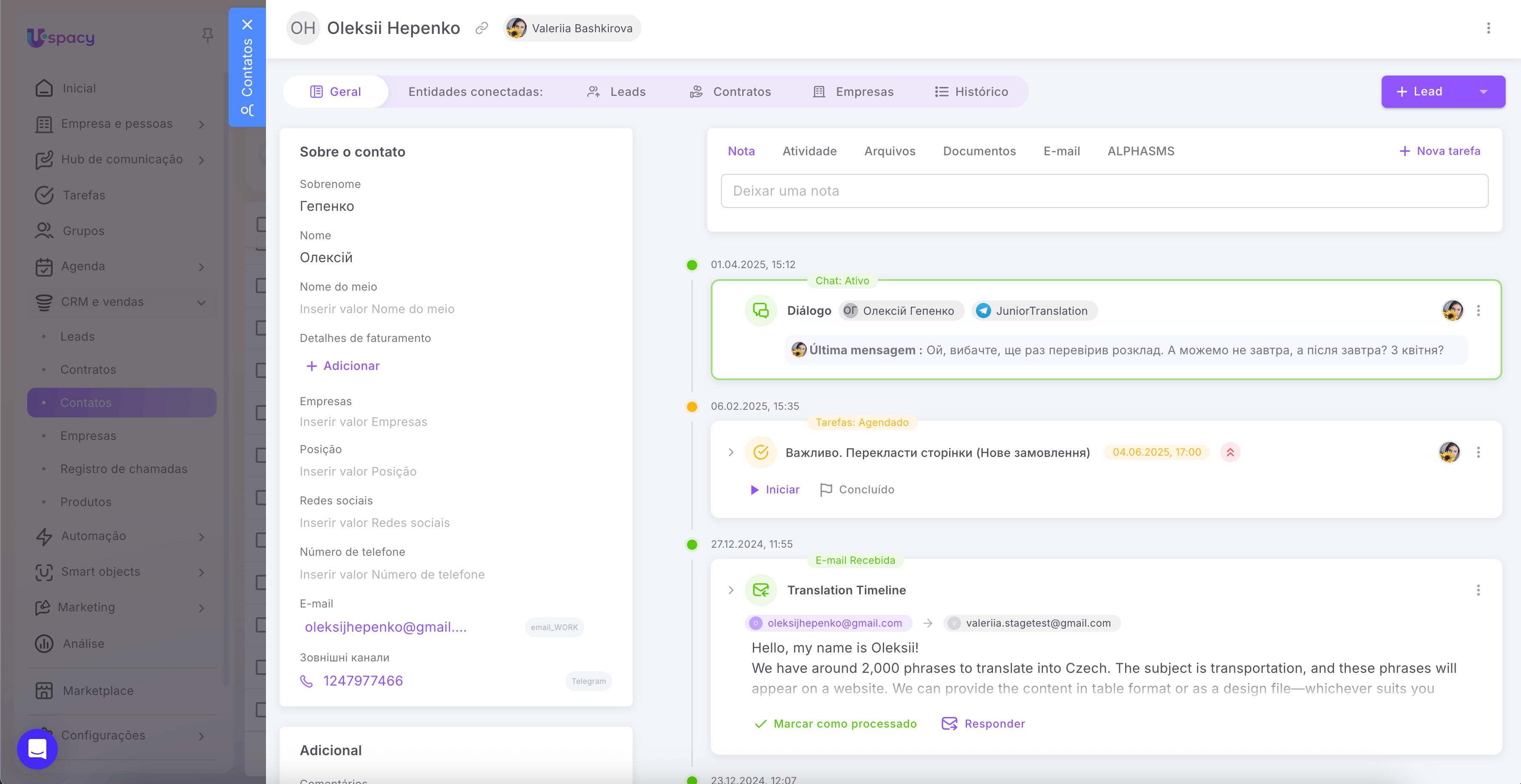 A principal mudança é transferir as informações dos clientes de chats pessoais para o CRM. Se necessário, você pode começar facilmente com um teste do Uspacy e completar essas etapas com orientação.